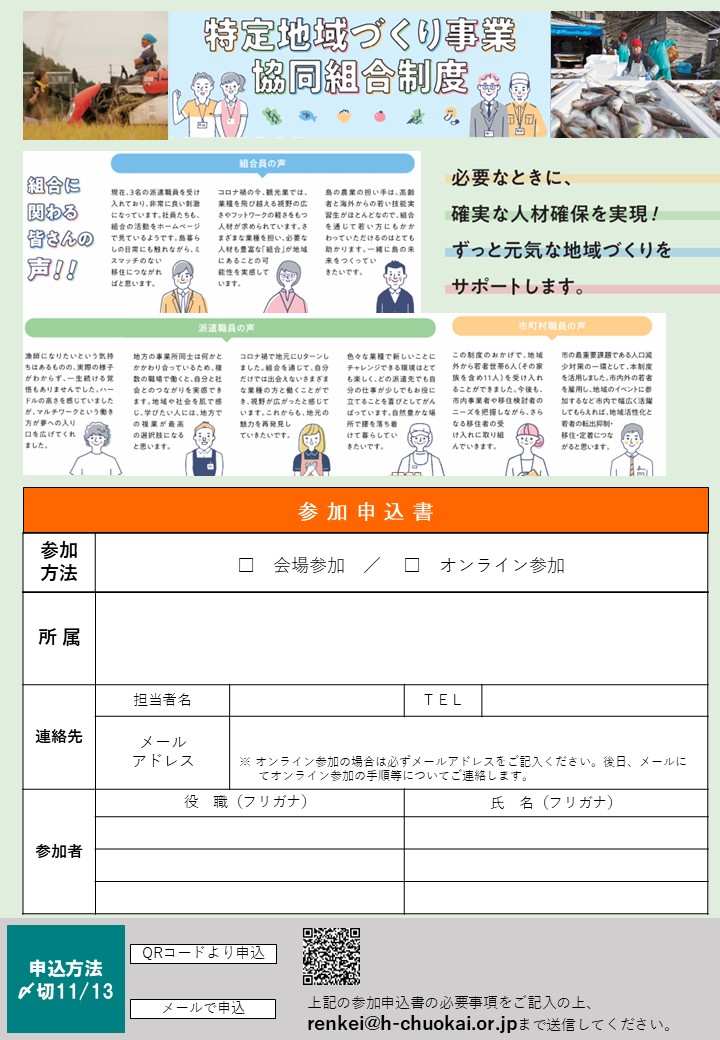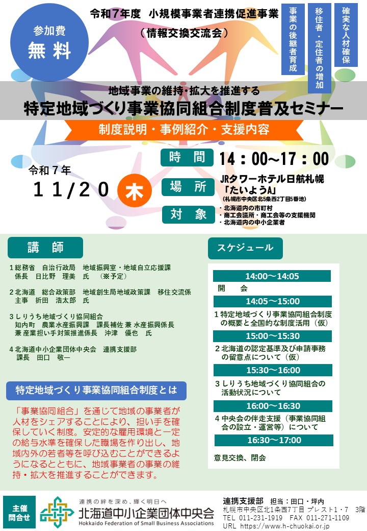 北海道中小企業団体中央会では、「特定地域づくり事業協同組合制度普及セミナー」を開催いたします。