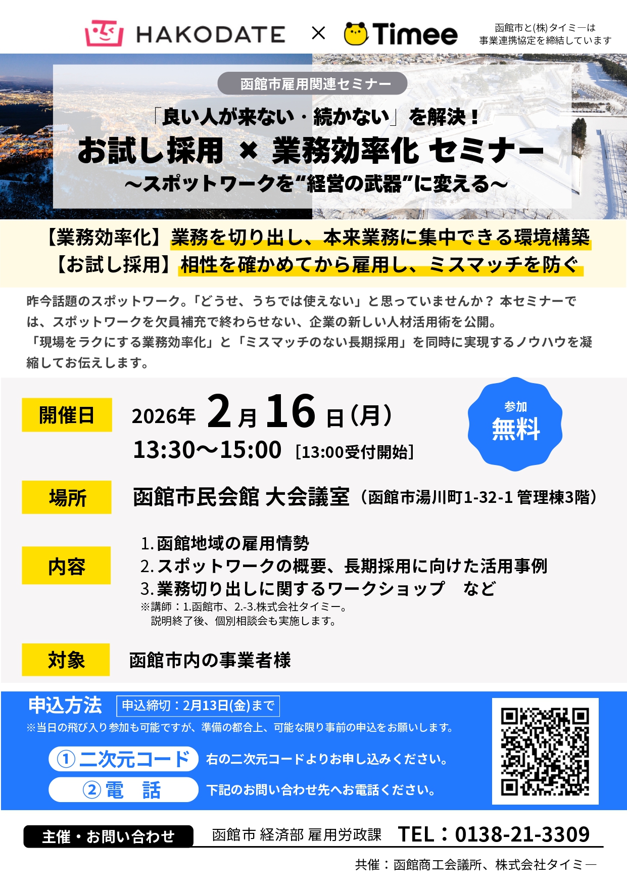 函館市では,女性・高齢者等の潜在人材の活躍および地域産業の多様な担い手の確保を通じた市内の経済活性化を図ることを目的に,株式会社タイミーと事業連携協定を締結しているところですが,この度,下記のとおり本協定に基づく企業向けセミナーを開催することとしましたのでご案内いたします。