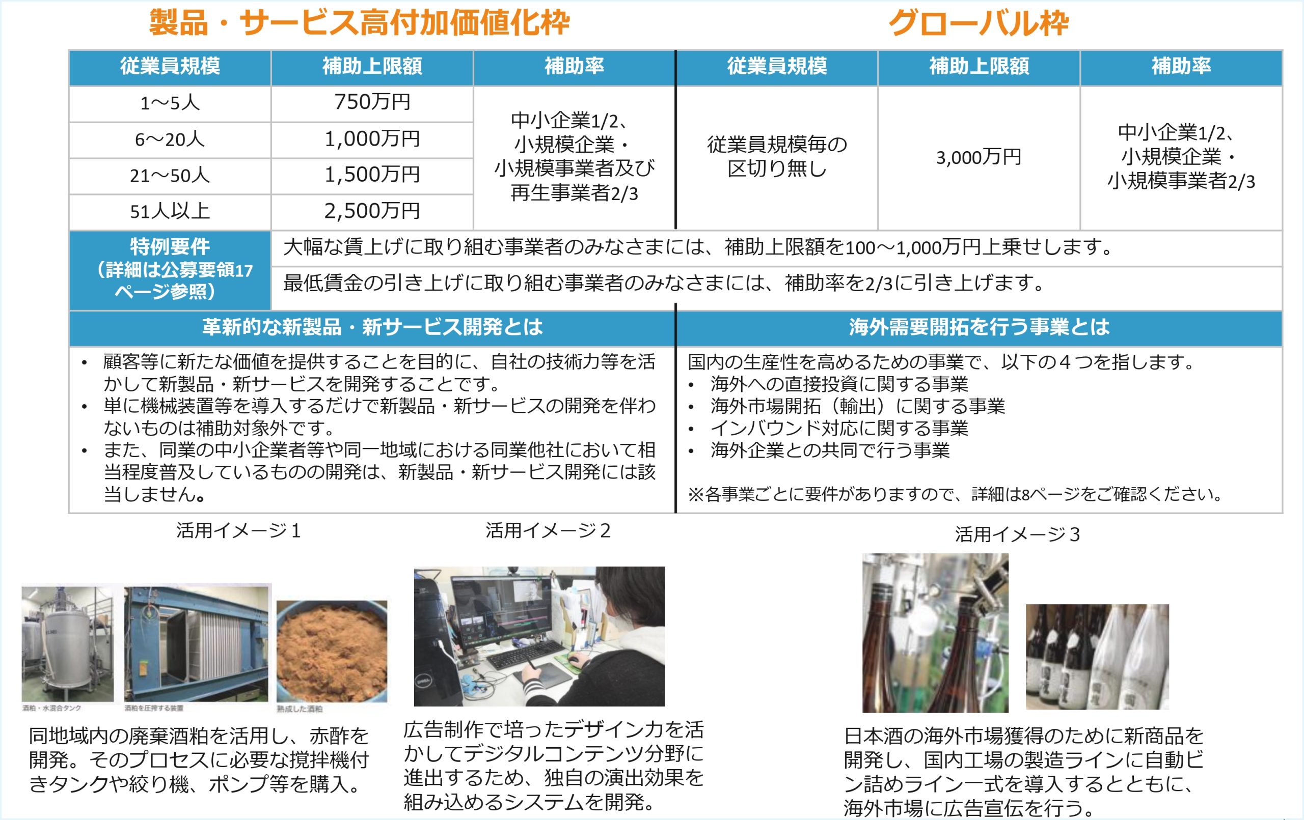 🔳「製品・サービス高付加価値化枠」については、生産性向上に資する取組を行うにあたって、年収350万円以上の正社員(無期雇用)を新たに採用する場合は、厚生労働省所管の「産業雇用安定助成金(産業連携人材確保等支援コース)」(以下「本助成金」という。)を併給できるケースがあります。