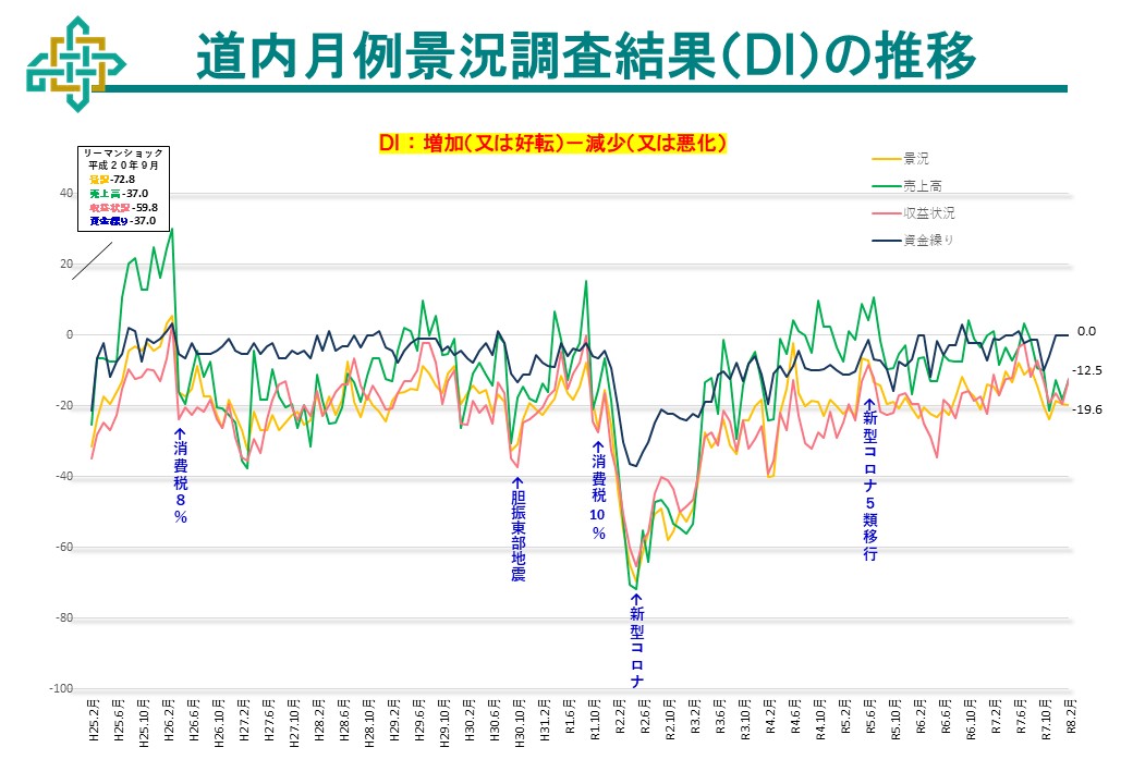 ※DI値とは、各項目について、調査月と前年同月を比較し、増加(または好転)したという回答から、減少(または悪化)したという回答を差し引いた値のこと。