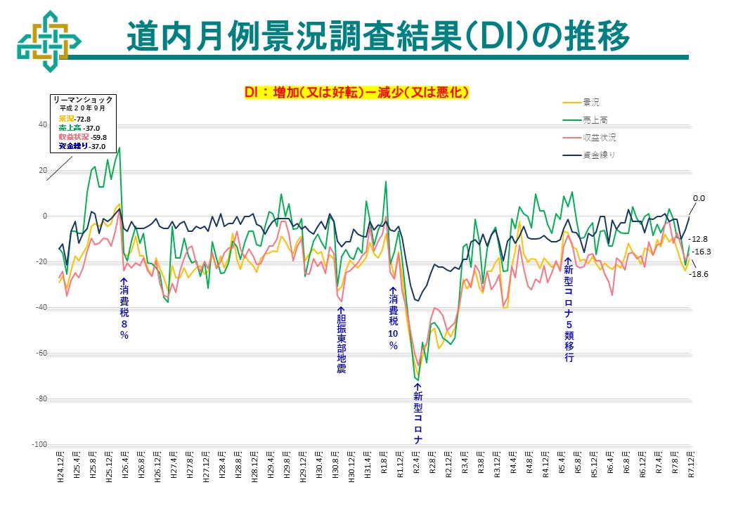 ※DI値とは、各項目について、調査月と前年同月を比較し、増加(または好転)したという回答から、減少(または悪化)したという回答を差し引いた値のこと。